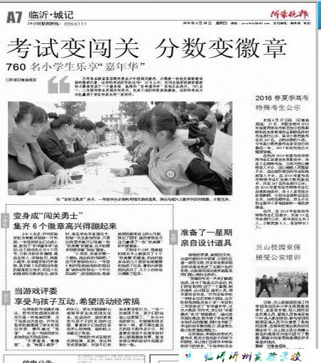4月28日,沂蒙晚報(bào)對(duì)我校一二年級(jí)考試評(píng)價(jià)改革進(jìn)行報(bào)道“考試變闖關(guān) 分?jǐn)?shù)變徽章”