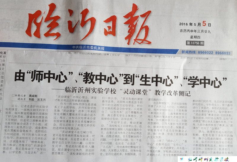 5月5日,《臨沂日?qǐng)?bào)》以《由“師中心”、“教中心”到“生中心”、“學(xué)中心”》為題,報(bào)道了我校整體推進(jìn)課堂教學(xué)改革的實(shí)踐探索過(guò)程,全文如下: