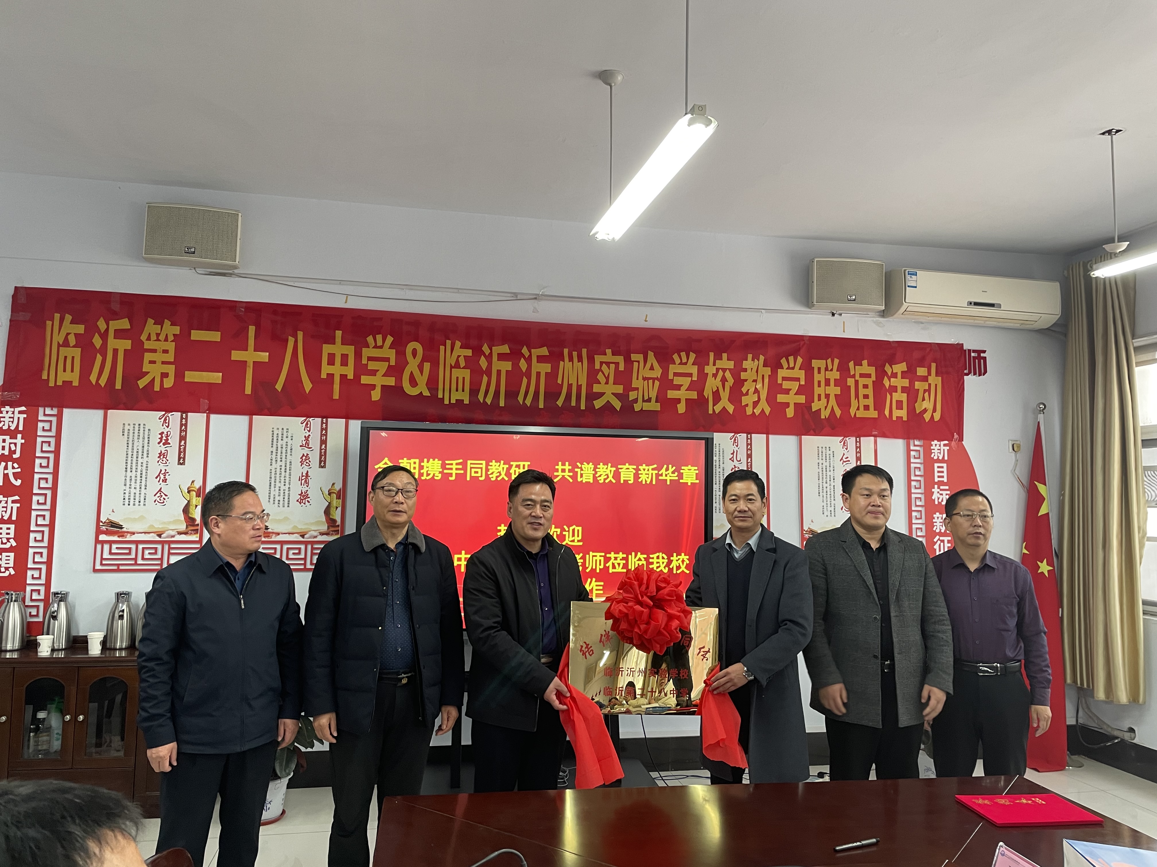 為全面提高教育教學(xué)質(zhì)量,促進(jìn)教師專(zhuān)業(yè)發(fā)展,推動(dòng)學(xué)校間互相交流,帶動(dòng)學(xué)校發(fā)展,2021年12月14日,臨沂第28中學(xué)謝士軍校長(zhǎng)帶領(lǐng)班子成員和骨干教師蒞臨我校進(jìn)行研討交流、合作共贏。我校黨委書(shū)記、校長(zhǎng)徐勤波同志率班子成員、相關(guān)教學(xué)管理干部、部分骨干教師參加了此次活動(dòng)。
