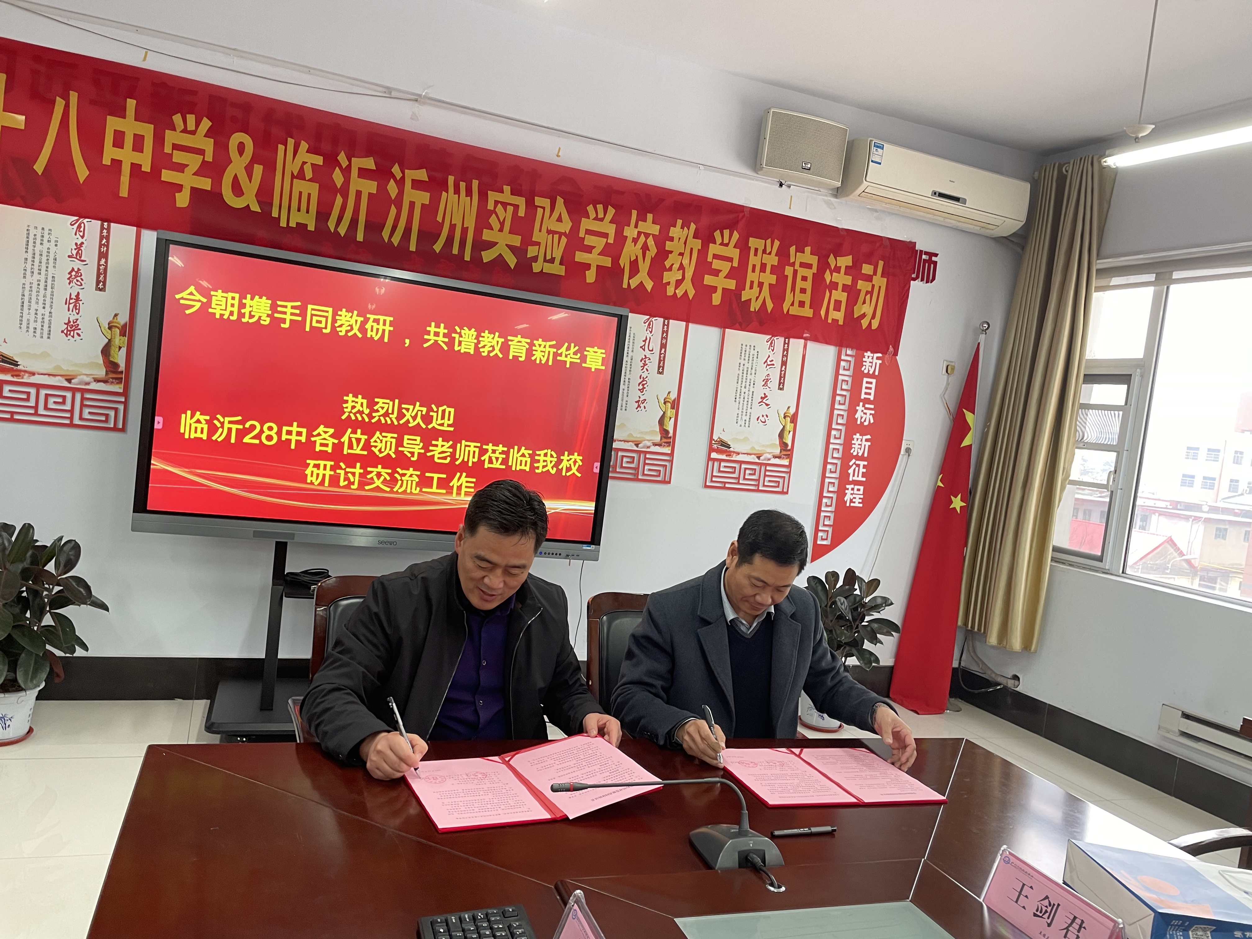 在三樓會(huì)議室,兩所學(xué)校的語(yǔ)文教研室負(fù)責(zé)人就研討成果向雙方校領(lǐng)導(dǎo)進(jìn)行了匯報(bào),授課教師陳老師談了自己參加活動(dòng)的感想。緊接著,臨沂第28中學(xué)和我校進(jìn)行了簽約儀式,雙方共同簽署了《學(xué)校結(jié)對(duì)發(fā)展共同體協(xié)議書(shū)》,兩所學(xué)校將在管理經(jīng)驗(yàn)、教學(xué)經(jīng)驗(yàn)、教科研經(jīng)驗(yàn)、學(xué)生互助交流等方面加強(qiáng)溝通,力圖實(shí)現(xiàn)開(kāi)放辦學(xué)、共享交流的目標(biāo),打造區(qū)域教育共同體,努力提高兩校教育教學(xué)質(zhì)量。