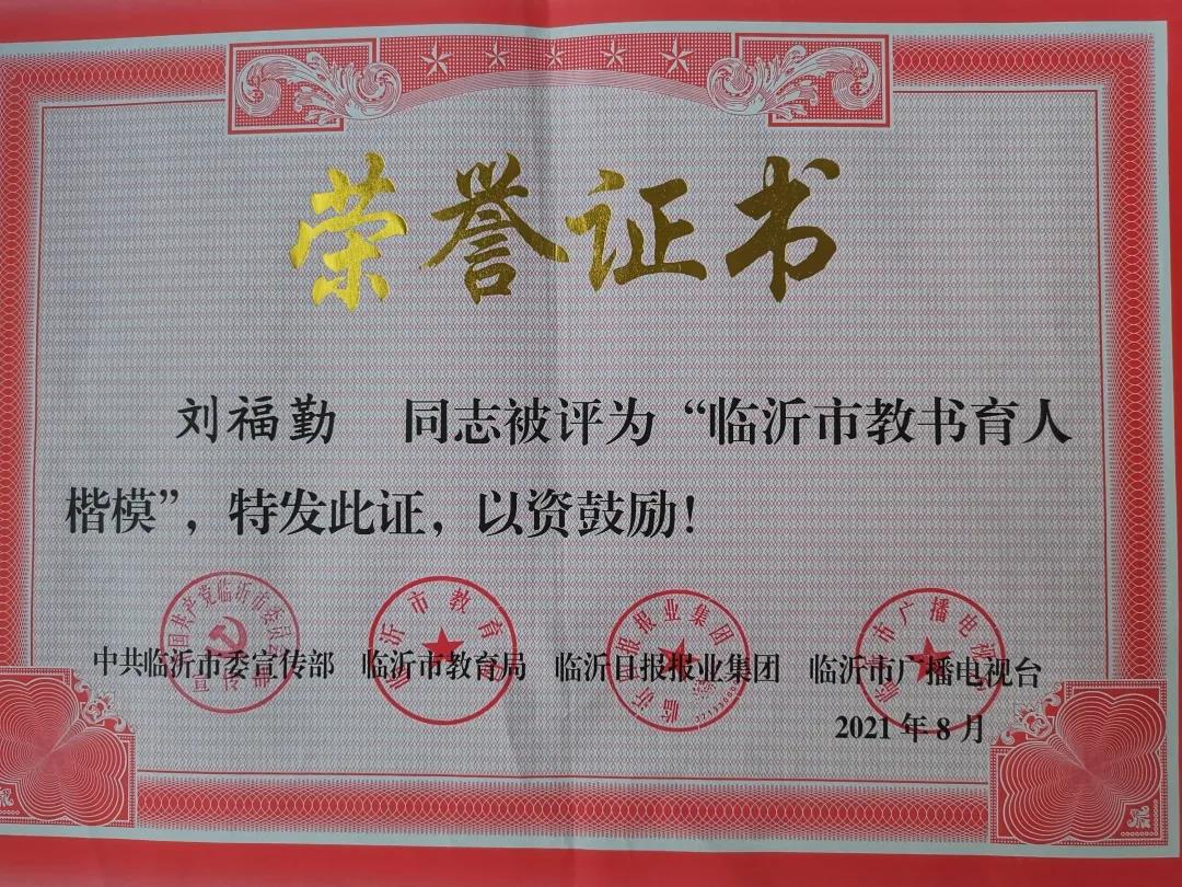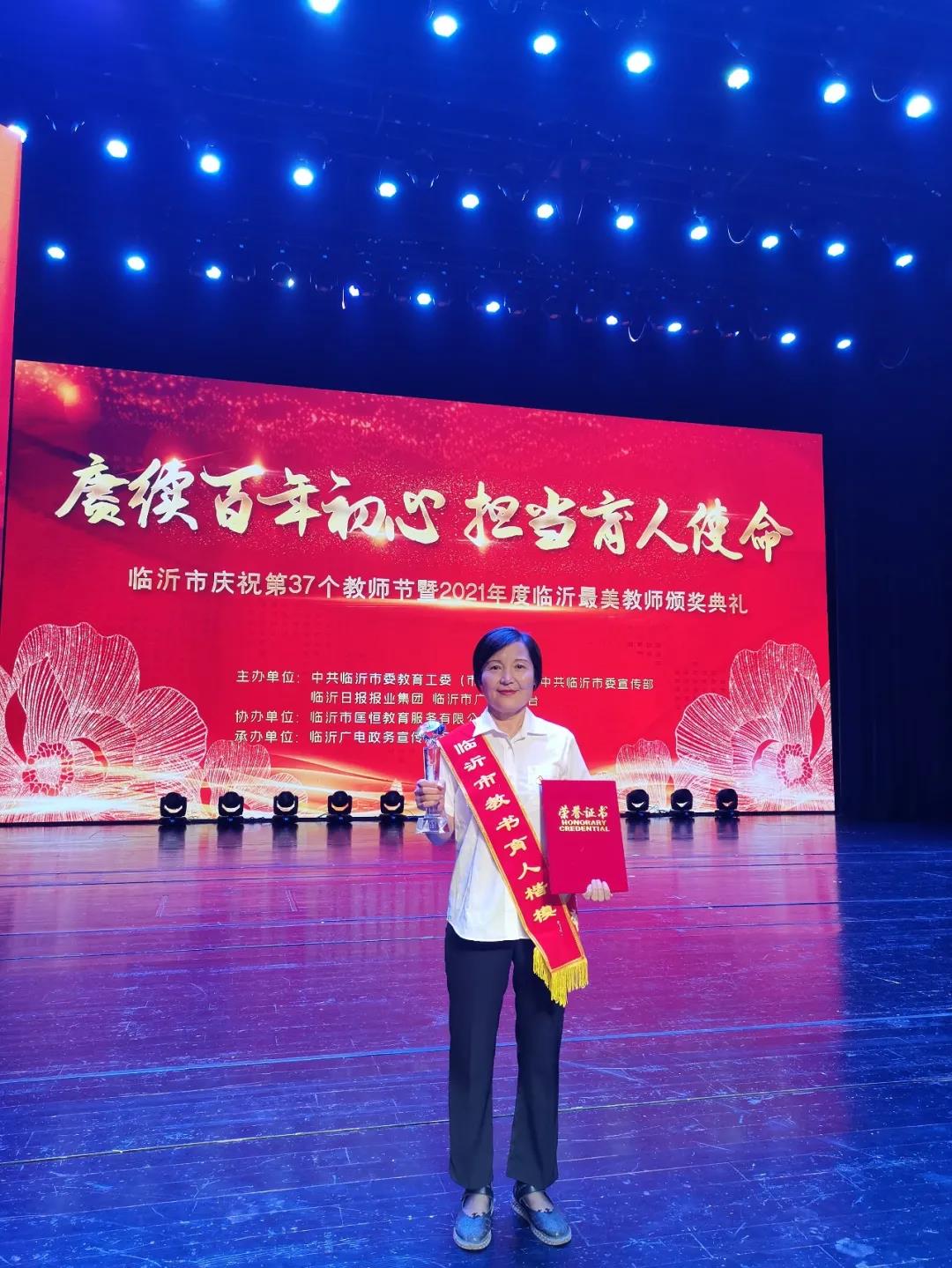 臨沂沂州實驗學(xué)校劉福勤老師被評為2021年度臨沂市教書育人楷模,市委教育工委常務(wù)副書記、市教育局黨組書記、局長陳海玲為其頒獎。
