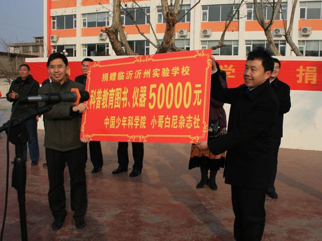 12月29日上午,中國少年科學(xué)院圖書、儀器捐贈(zèng)儀式在我校塑膠操場隆重舉行。出席捐贈(zèng)儀式的有中國少年科學(xué)院張典慧秘書長,全國十佳青少年科技輔導(dǎo)員、特級教師周又紅教授,小哥白尼雜志社的領(lǐng)導(dǎo),臨沂市共青團(tuán)市委吳鵬書記,臨沂市教育局杜以堅(jiān)副局長以及齊魯晚報(bào)、臨沂日報(bào)、沂蒙晚報(bào)、臨沂廣播電視報(bào)、臨沂電視臺等新聞媒體的朋友,我校3300名師生參加了捐贈(zèng)儀式。儀式由徐勤波書記主持。