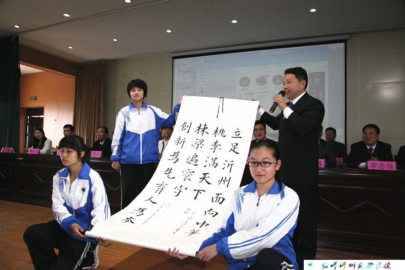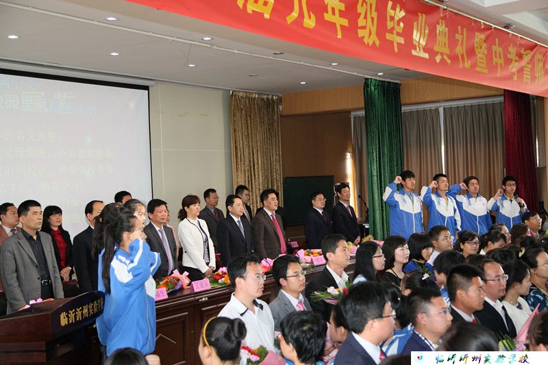 學生代表王堯同學向?qū)W校進獻書法作品——“立足沂州,面向中華,桃李滿天下;創(chuàng)新為先,育人為本,棟梁遍寰宇!”一副對聯(lián)表達了畢業(yè)生們對學校的感激及祝福。接著學生代表給老師獻上了美麗的鮮花,以此來表達對老師的由衷感謝。在老師的致謝及學生的掌聲中,本次大會又一次展示出它的震撼性。最后,隨著全體師生高唱《畢業(yè)生》及學生的莊嚴宣誓,本次畢業(yè)典禮暨中考誓師大會圓滿落幕。會后領(lǐng)導(dǎo)合影,各班也合影留念。