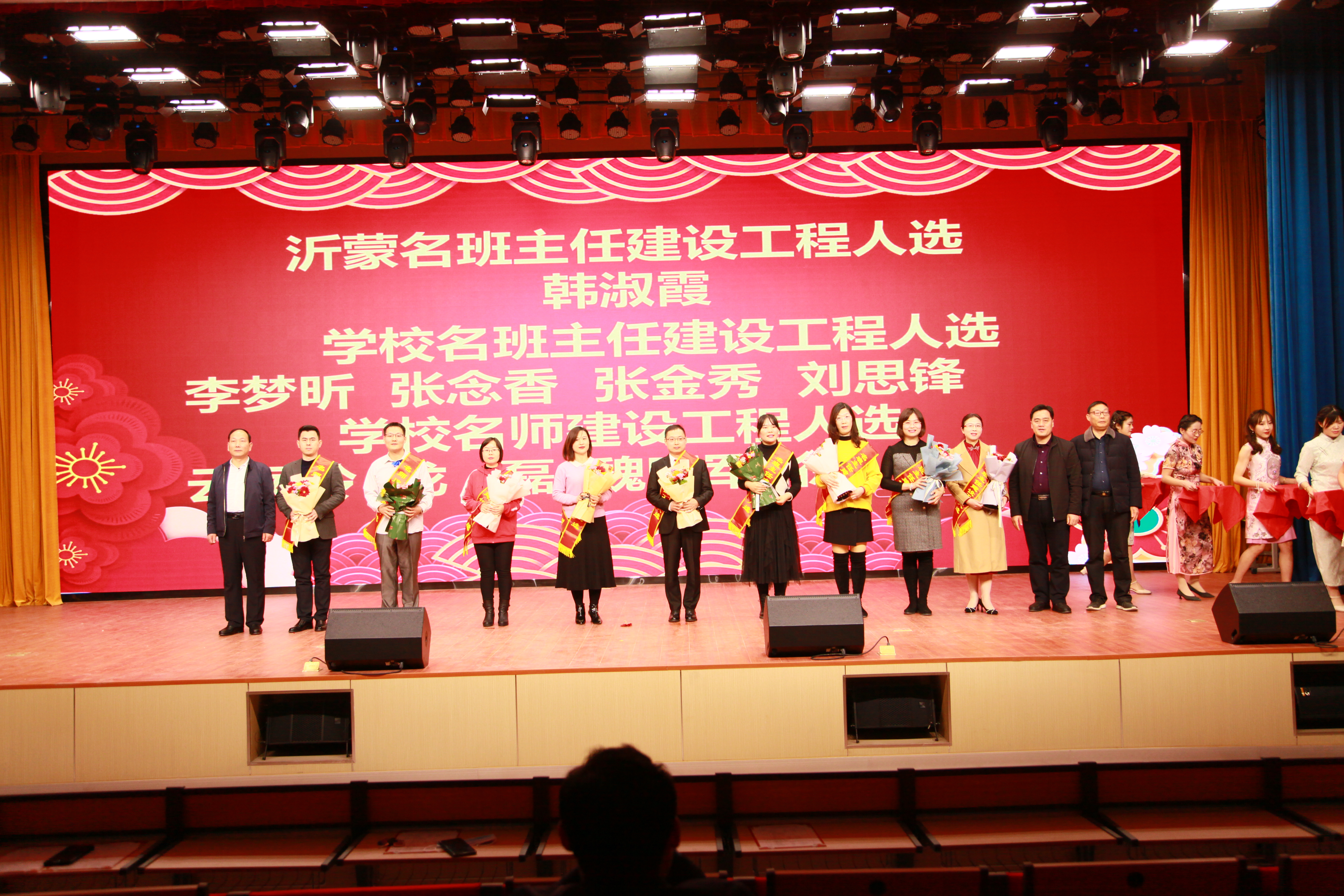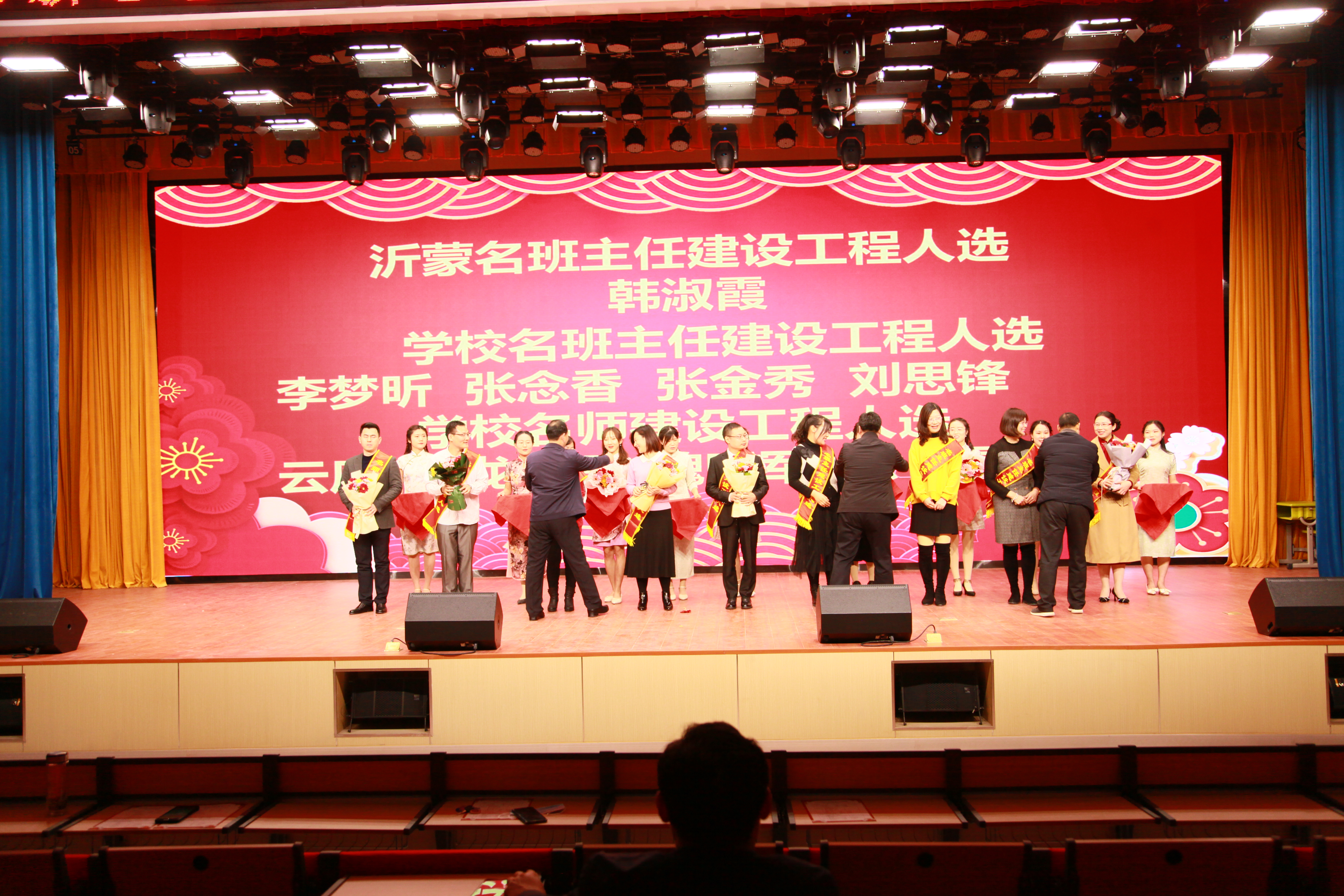 伴隨著激昂的進行曲,我校沂蒙名班主任建設工程人選韓淑霞;學校名班主任建設工程人選李夢昕、張念香、張金秀、劉思鋒;學校名師建設工程人選云鳳玲、龍磊、魏曉軍、徐雷邁著堅定的步伐走上主席臺。我校領導班子給名師、名班主任工程人選獻花并合影留念。