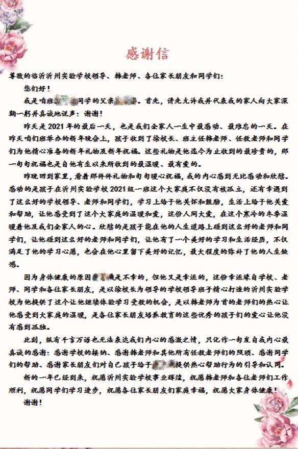 “請允許我向大家真誠地說一聲:謝謝!”2022年第一天,一封感謝信出現(xiàn)在了七年級一班家長群當中,王曾亮父親的真情流露讓老師和同學們無比動容。