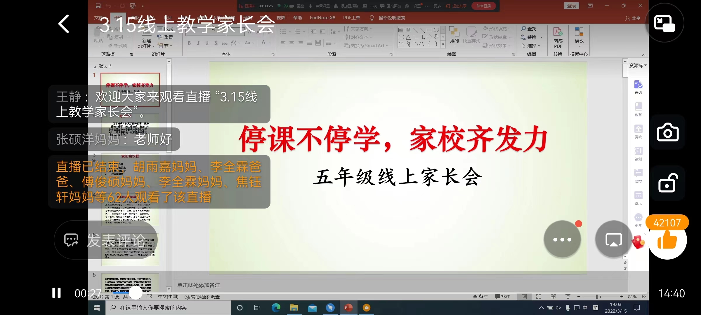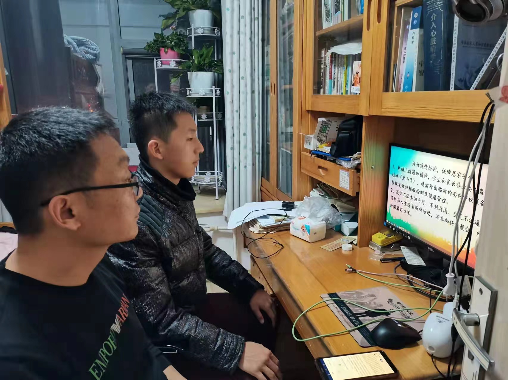 班級層面則是加強溝通交流、攜手家長共克時艱。各班先是在班內(nèi)召開“線上教學,有你有我”主題班會,引導學生加強自律,積極參與線上教學;隨后在3月15日晚上分年級召開“家校攜手,共克時艱”線上主題家長會,引導家長注重孩子居家期間學習、生活習慣的養(yǎng)成、親子關(guān)系的協(xié)調(diào)以及排解家長的焦慮情緒,并強調(diào)了學生居家安全教育等。有的班主任老師還親近部分學生在線學習現(xiàn)場,了解學生居家學習情境與適應情況,讓學生倍感欣慰與鼓舞。這些家校聯(lián)動,確保了線上教學有序開展。