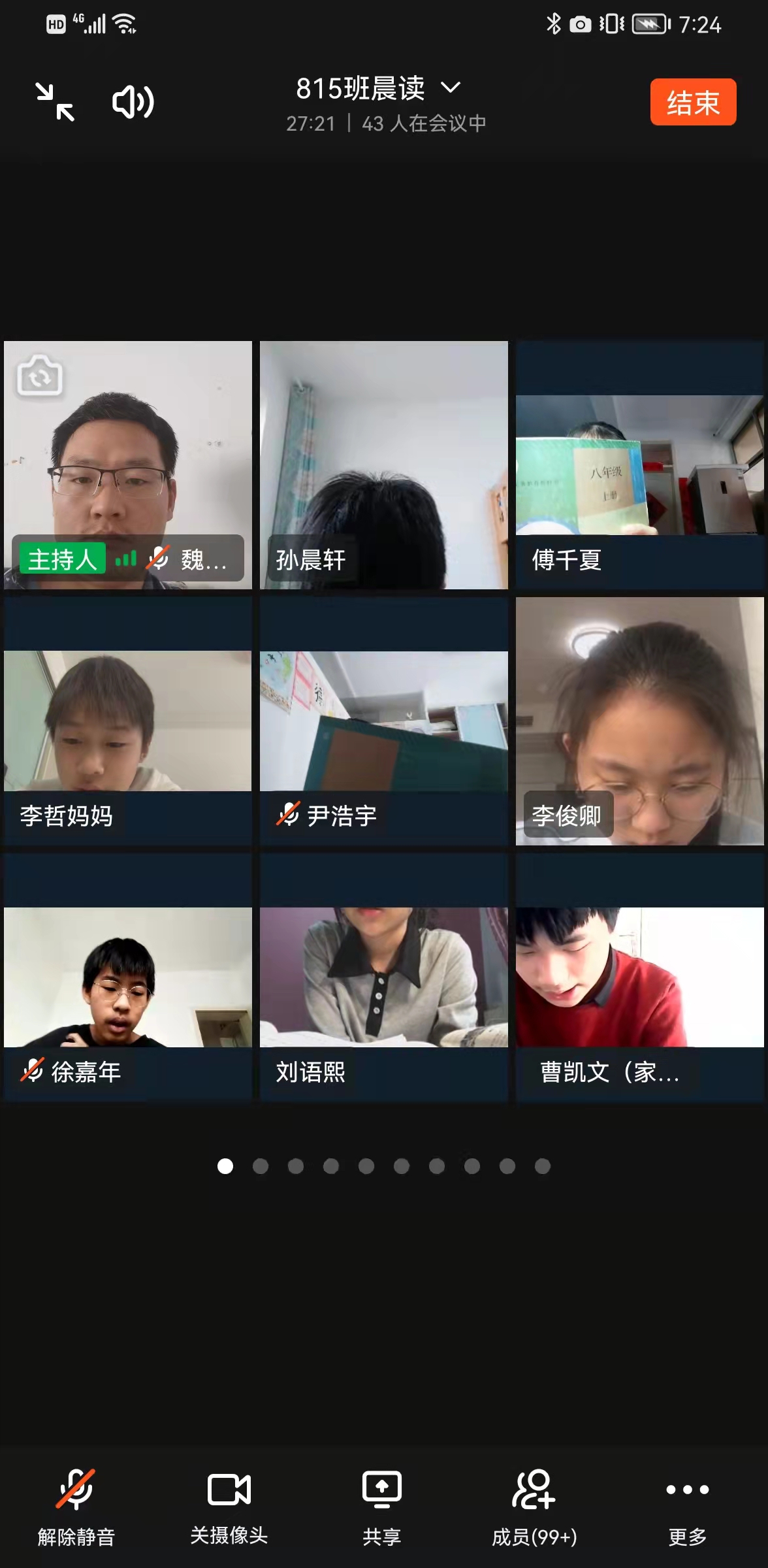 清晨的到來,一切如常。釘釘?shù)慕行逊?,會議模式的早讀見面,學生如約而來,教師如期而至,自主的學習,互動的交流,20分鐘的網(wǎng)課面對面,有些新鮮但也和線下教學差別不大,還有近30分鐘的體育狂嗨,也有藝術(shù)課程的色彩紛呈……滿滿當當,卻也有緊有松,勞逸結(jié)合中,愉快的線上教學第一天就要過去了,線下學習已然順利過渡到線上學習。