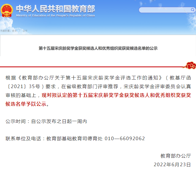 近日,教育部發(fā)布關(guān)于第十五屆宋慶齡獎(jiǎng)學(xué)金獲獎(jiǎng)候選人和優(yōu)秀組織獎(jiǎng)獲獎(jiǎng)候選名單的公示。在這份最新權(quán)威公示的國家級(jí)獎(jiǎng)學(xué)金名單中,臨沂沂州實(shí)驗(yàn)學(xué)校七年級(jí)一班的侯妙可同學(xué)成功入圍!