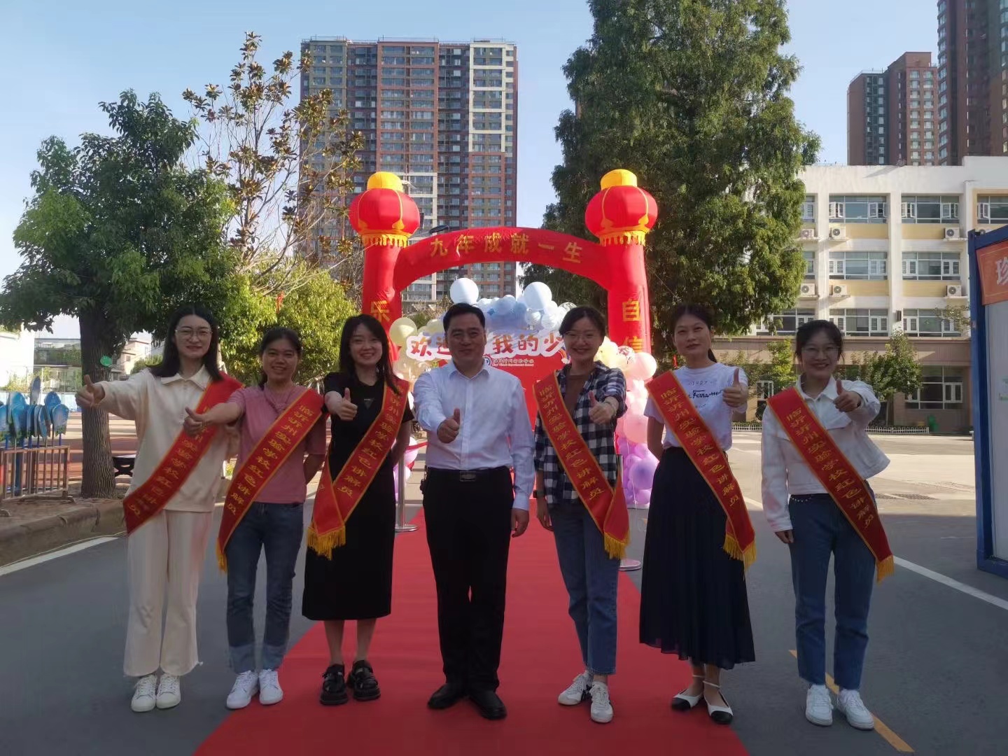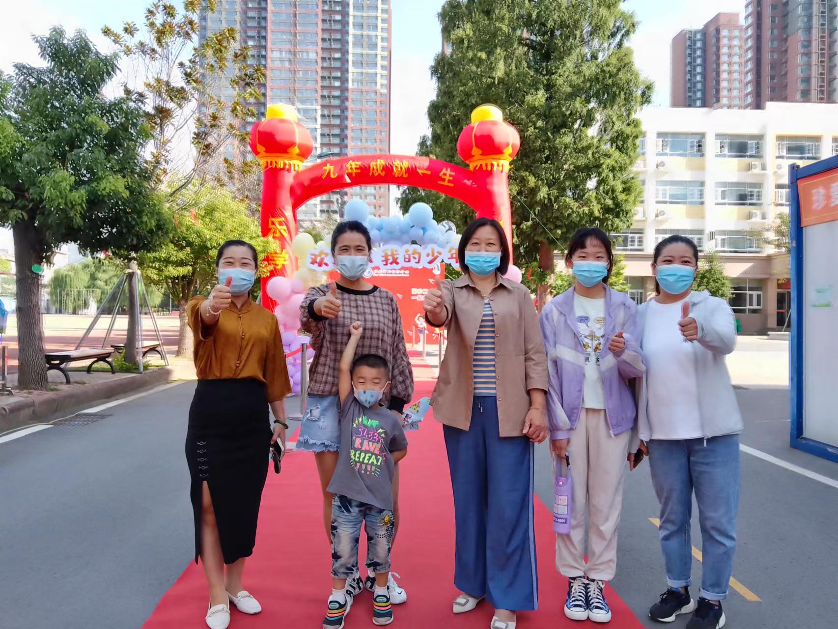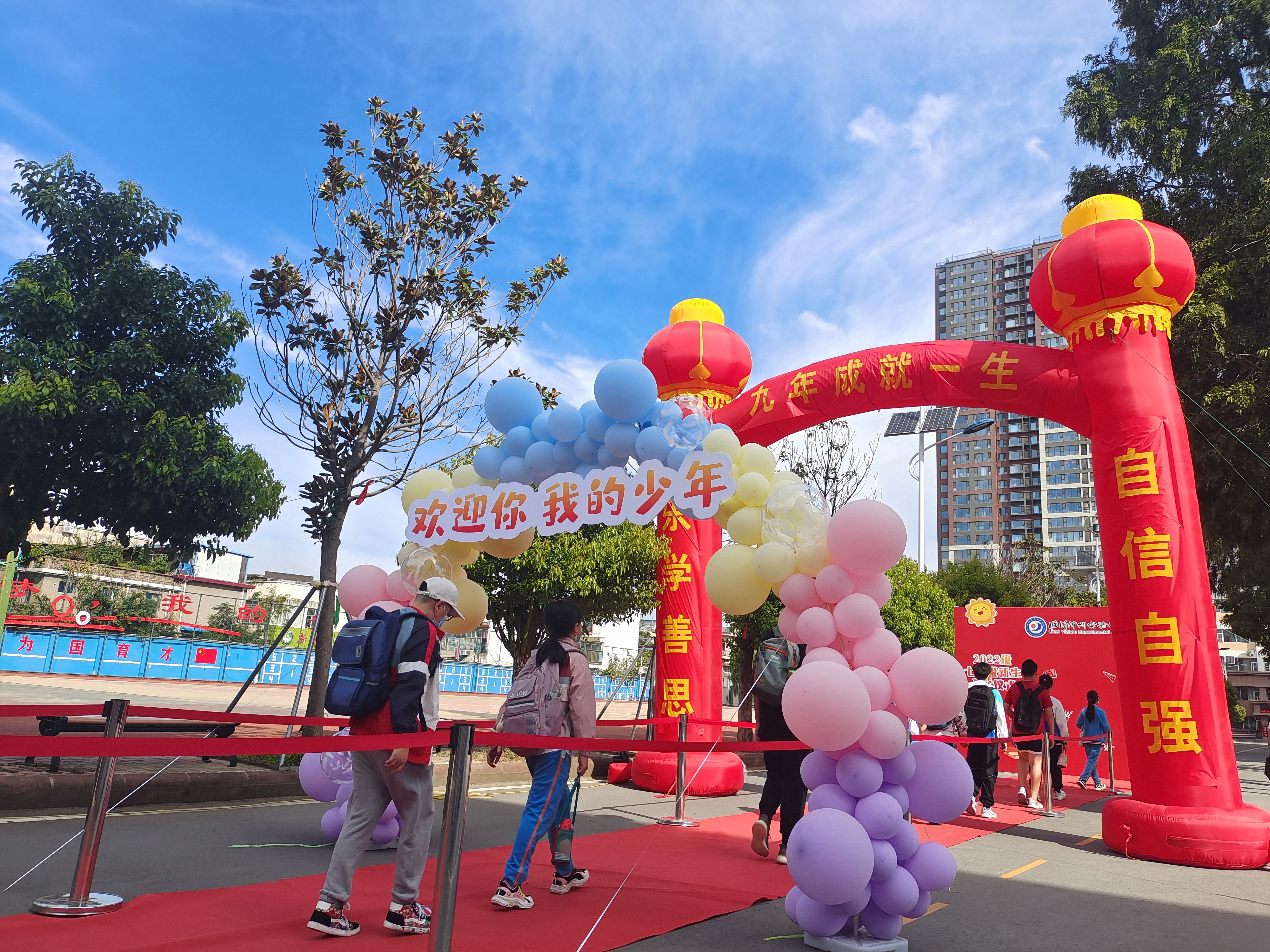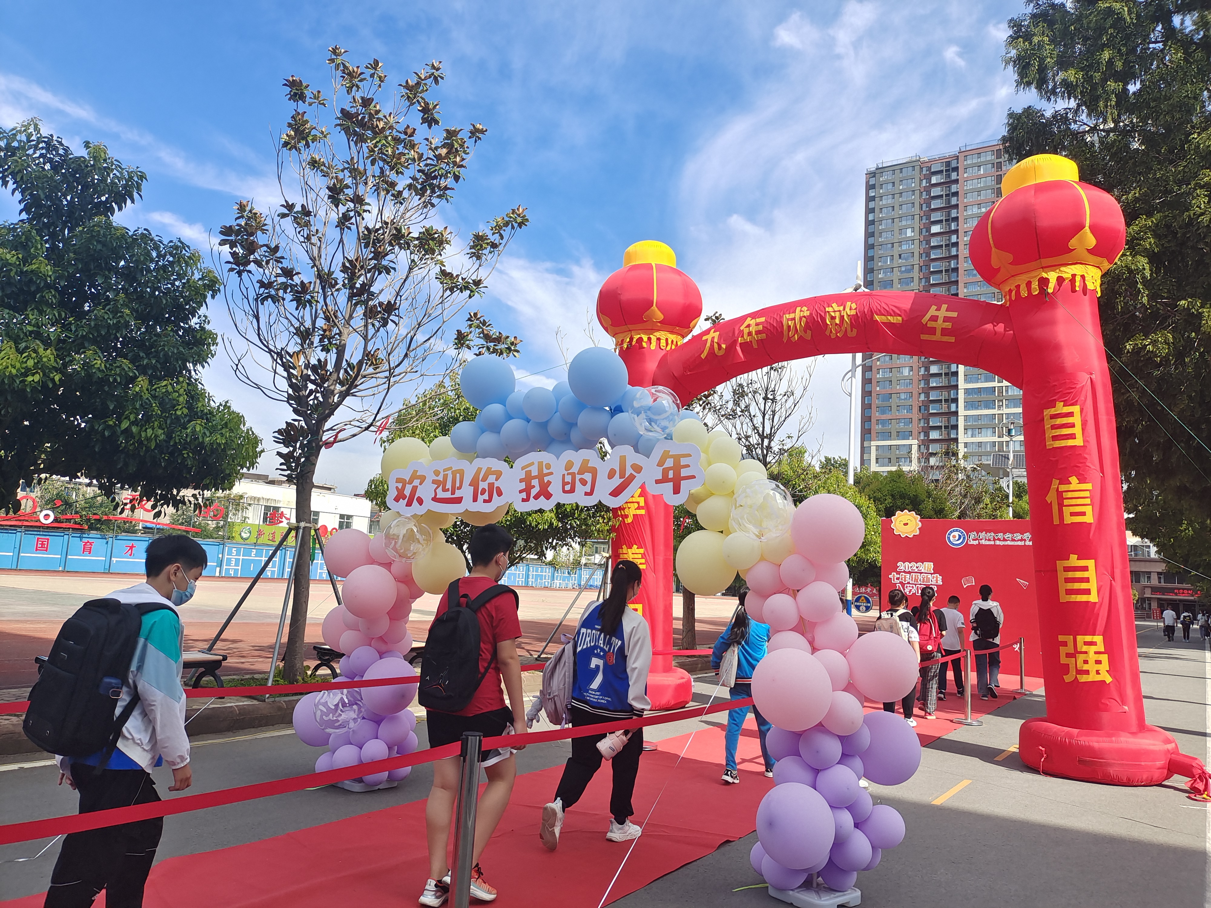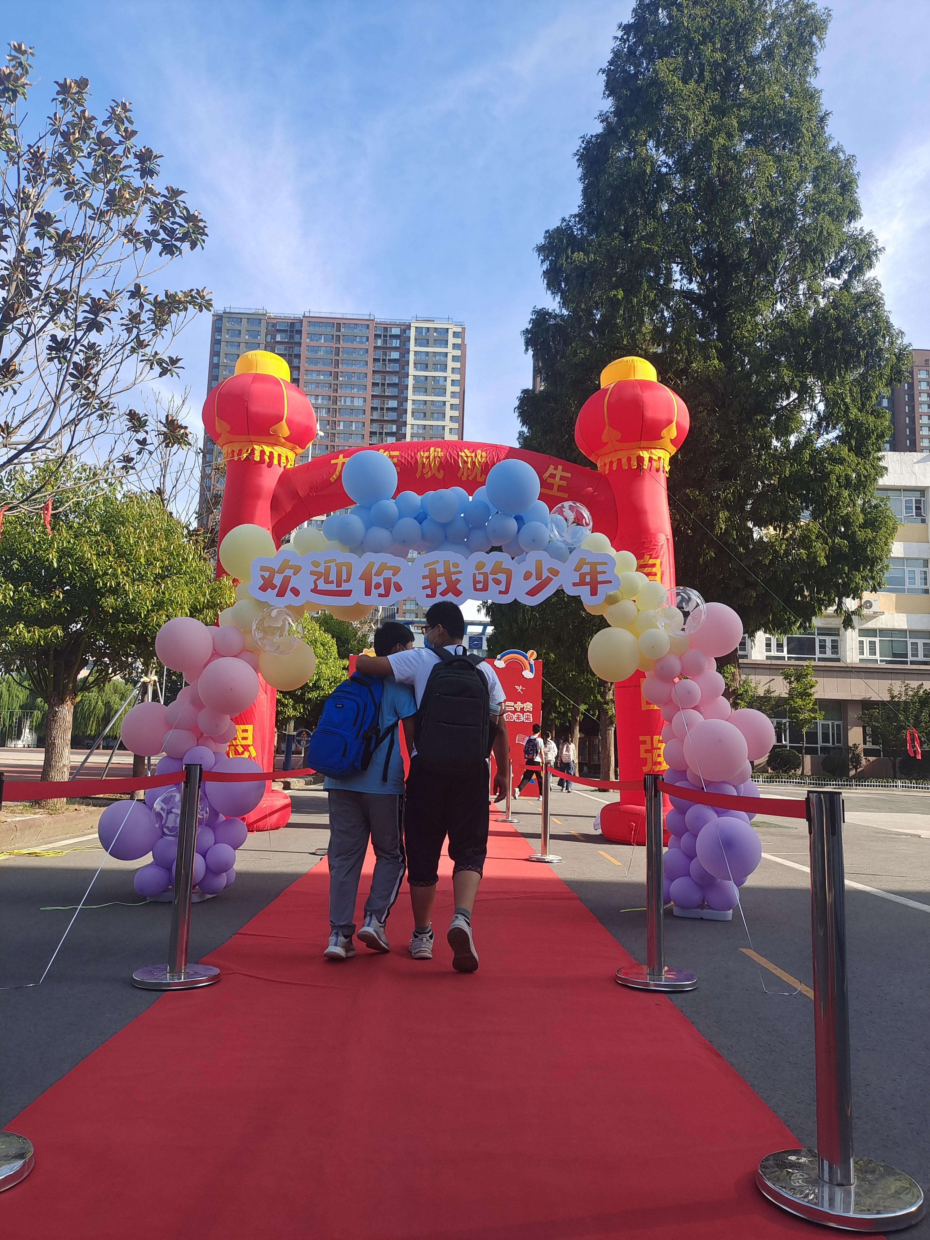 按照防疫規(guī)定,新生們遵守錯時錯峰的要求,分批入校。滿懷期待的同學們依次步入象征著年輕力量和無限希望的彩色氣球門,走上紅毯,穿過“九年成就一生”的紅色拱形門,最后到達“臨沂沂州實驗學校七年級入學儀式”打卡墻,合影留念。學校領(lǐng)導和各班班主任們紛紛與新生合影留念,用明媚的笑容和溫暖的話語迎接著大家的到來。同學們在這里留下了珍貴的第一張照片,紀念這人生中意義非凡的瞬間。陽光揮灑在他們明媚的笑臉,微風吹拂過他們矯健的身姿。