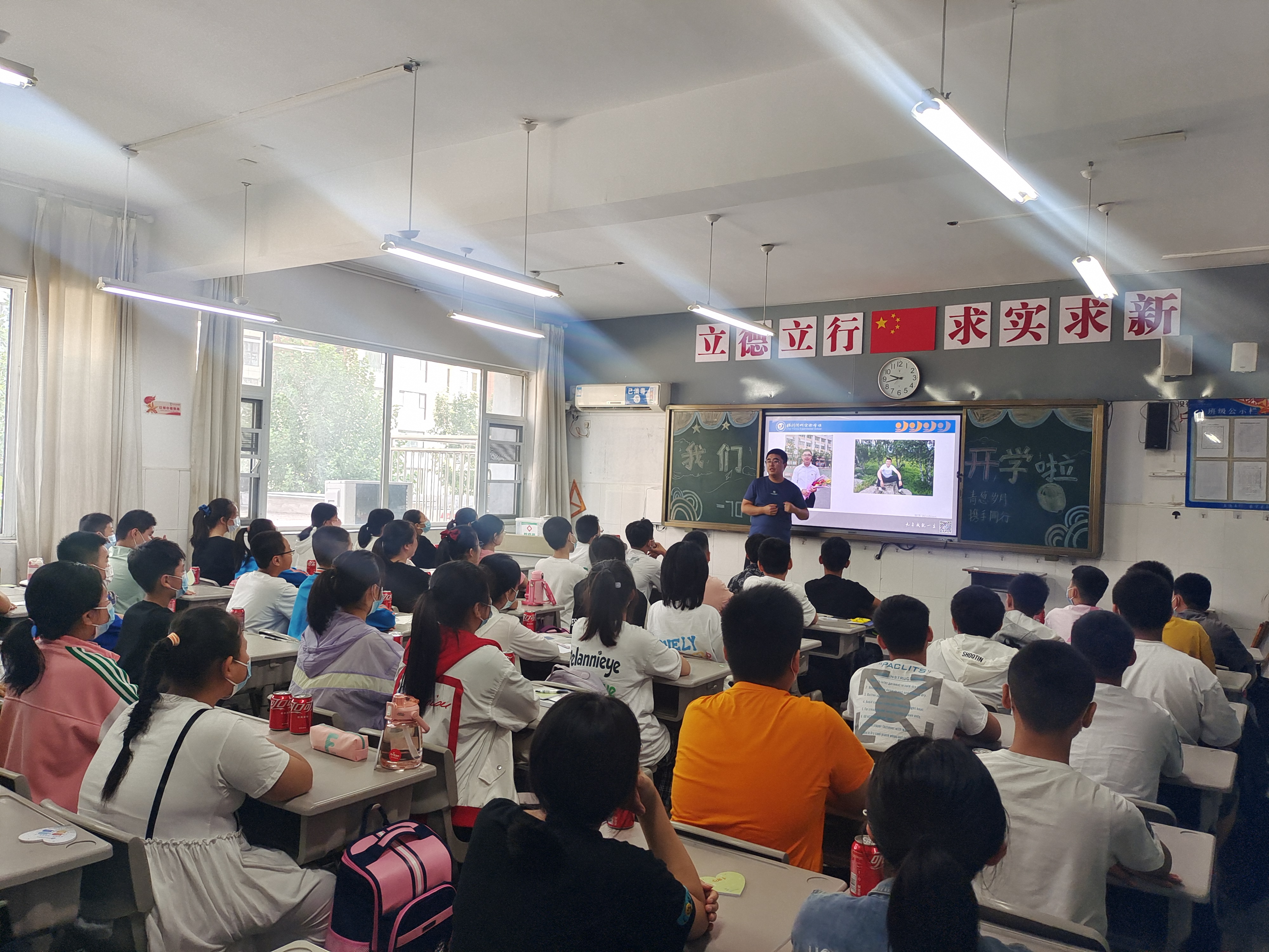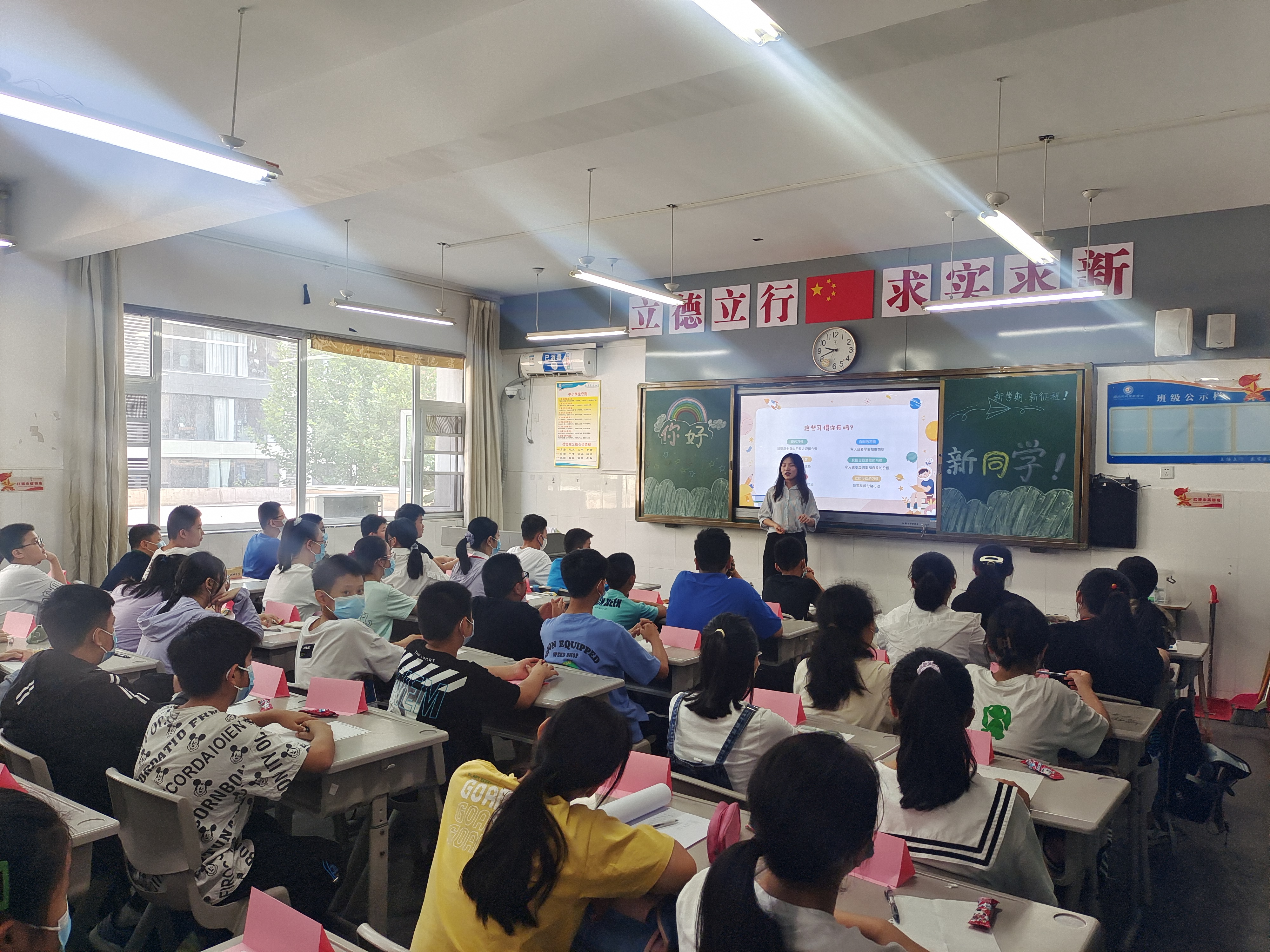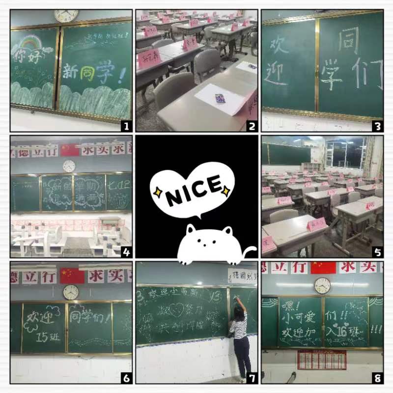 隨后,同學們迎著朝陽,邁向了知識的殿堂——教室。班主任們都絞盡腦汁,用心準備了專屬于自己班級的歡迎儀式。有的班級畫了精美的黑板報,有的班主任給每位同學提前制作了姓名牌,還有的班主任給每位同學準備了開學小禮物……班主任們給大家簡單介紹了學校和班級的情況,鼓勵他們認識新同學。在自我介紹和交流溝通中,孩子們的緊張與不安消失了,笑容綻放在教室里,也綻放在每個學子的心中。