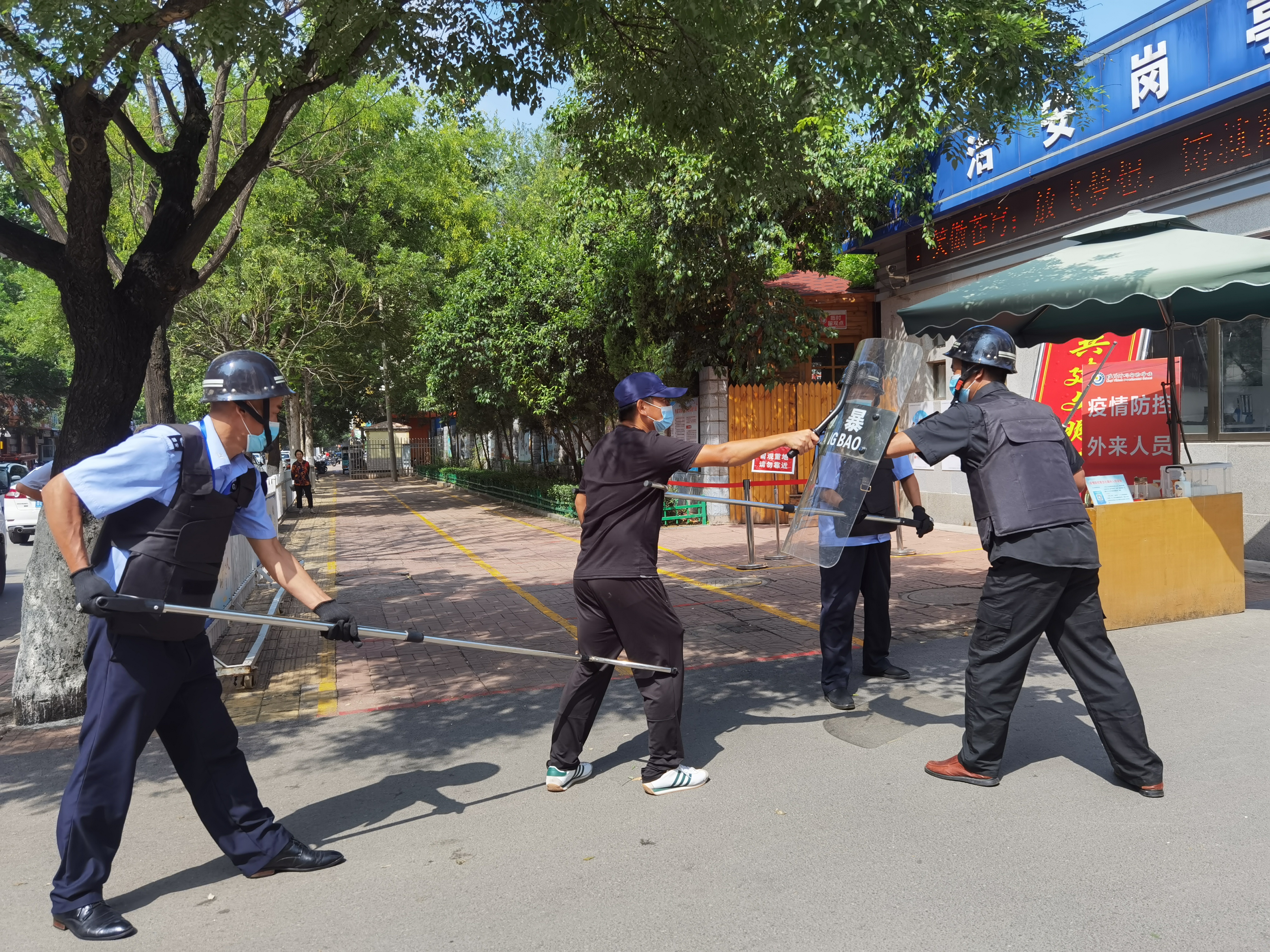 可疑人員情緒激動,突然拿出器具,并企圖沖進(jìn)學(xué)校,多名保安人員立即行動,使用安防器械,相互配合,對沖擊校園的“歹徒”進(jìn)行制止阻攔。