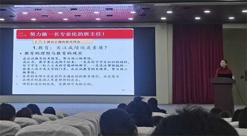 韓淑霞主任的《班主任綜合素養(yǎng)要求下的班級建設與班級管理》專題報告從“實踐層面”“方法層面”“理念層面”三個方面展開。她從青年教師的培養(yǎng)角度出發(fā),指出從實踐層面上,要高效落實初始年級的行為習慣養(yǎng)成課程與學科思維建構課程和三操課程,實施基于小組合作機制的班集體建構和班級文化建設;在方法層面上,從新時期班主任工作的關鍵點出發(fā),班主任要理解尊重學生,做到嚴愛相濟,堅持德智并育,將羅森塔爾效應、霍桑效應、多元智能理論和最近發(fā)展區(qū)理論與教育實踐相結合,鍛造具有凝聚力的班集體,做學生幸福生活的創(chuàng)造者和建設者。最后,韓主任從理念層面進行了闡釋。韓主任先是從新時期班主任專業(yè)化綜合素養(yǎng)的角度闡釋了班主任要具備堅定的教育信念和情懷、獨特的人格魅力和優(yōu)良品德、全面系統(tǒng)的專業(yè)知識素養(yǎng)、超強的教育教學能力和組織協(xié)調(diào)能力、較強的思想政治工作水平和心靈溝通能力;接著從專業(yè)化班主任成長的角度詳盡闡述了班主任如何形成強烈的職業(yè)認同感,擁有正確的教育理念,練就過硬的管理功夫,保持平和的心態(tài),持續(xù)開展教育實踐,做新時期學生成長的引路人。報告的最后,韓主任跟與會人員分享了做具有職業(yè)幸福感的班主任的建議,引起了與會老師的強烈共鳴!