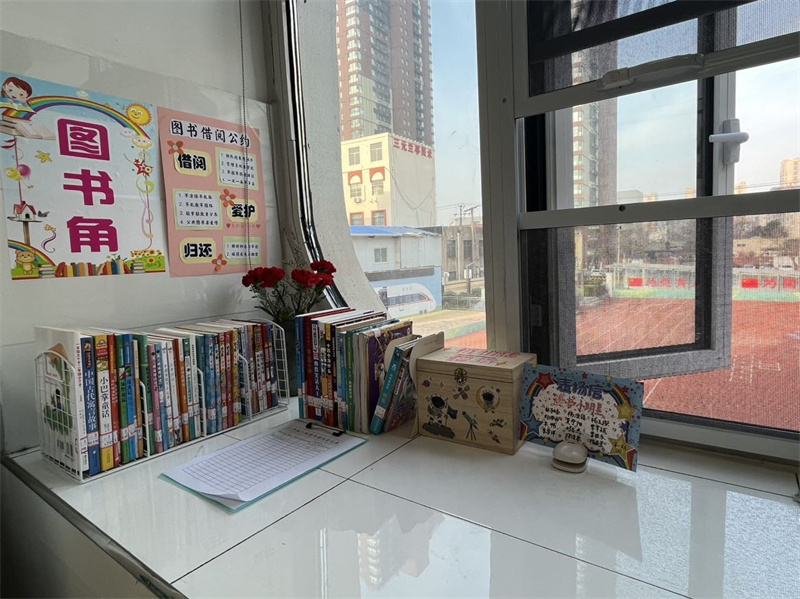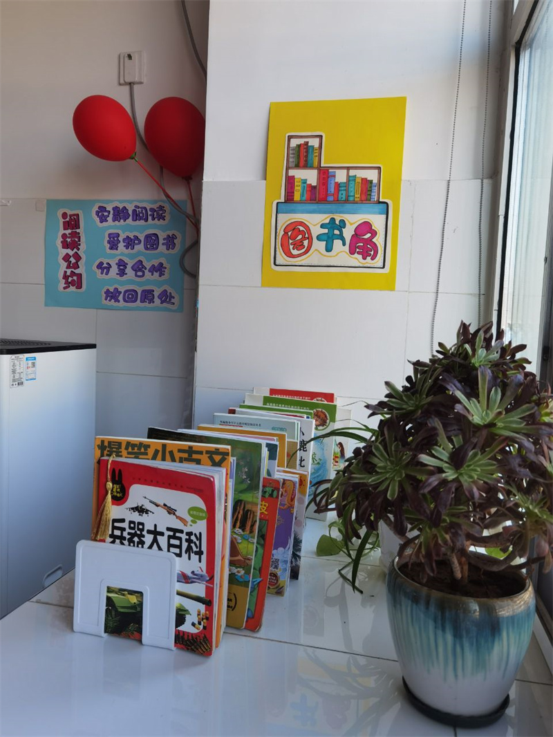 班級教室辟出一塊區(qū)域專設圖書角,圖書量充足,擺放整齊,有規(guī)范的借閱管理制度。同學們用圖畫、綠植等裝飾品美化這一方小角落,讓這里整潔優(yōu)美,書香氣氛濃厚,形成有各班特色的相對獨立的閱讀區(qū)域。